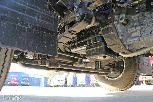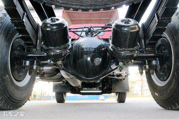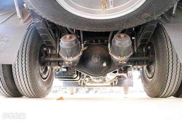 采用青特325H七吨后桥,为重载设计的后钢板悬架,带10+4片主副板簧,并且都经过加厚处理,速比为4.875。另外,该车储气筒与油箱都升级为了铝合金材质,实现了轻量化,油箱容积为150L。