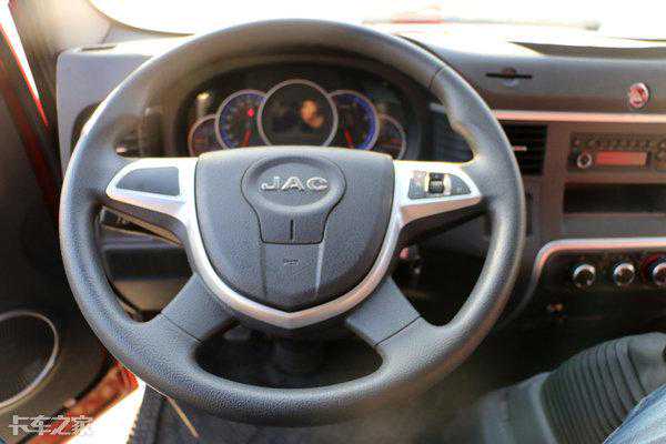 江淮骏铃V6轴距为3308mm,匹配4.2米的仓栅式货厢。在外观造型上运用多种线条,特别是“JAC”车标下方营造出的凹凸感,配合双U形的镀铬进气格栅,使得整车很有层次。转向灯和大灯分开布置,转向指示灯设计在大灯上方,呈“眉毛”状,特别有神。