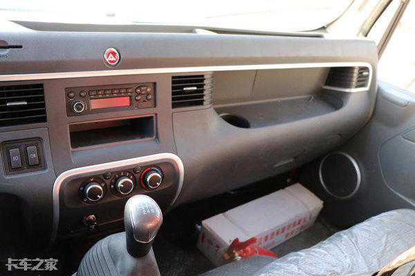 车内空间较为宽敞,内饰主要采用黑、棕进行搭配,辅以镀铬饰条点缀,看着具有层次感,更显活力。主副驾出风口带有杯托,可在夏季与冬季冷暖饮料,非常人性化的设计。配置上与大部分轻卡相同,带有电动车窗、中控锁、空调、收音机等。