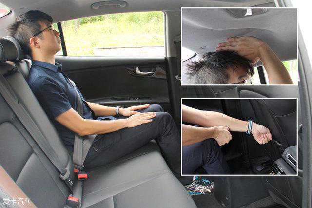体验者来到后排,头部空间剩余3指,腿部空间则达到了2拳以上。后排纵向的空间优势十分可观。