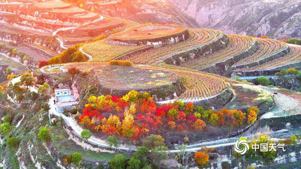 10月16日,甘肃华池黄岔,山峦上秋叶色彩斑斓,绚丽多姿,阳光洒落,给粗犷豪迈的山峦增添一份柔美之感。(图/文杨晓娟折兴发)