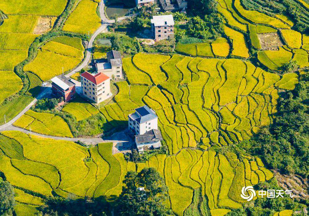 10月23日,福建永定奥杳,金黄色的稻田如一幅丰收画卷。(图/岳瀚文/苏慧君)