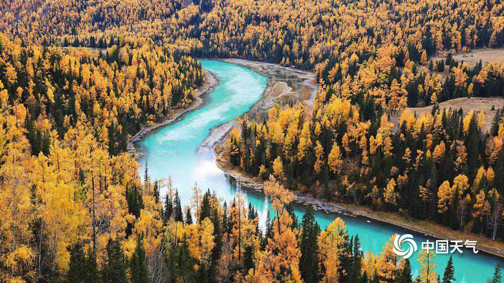 10月8日,秋天的喀纳斯,黄色成了主色调,整个山峦都变成了金黄色,喀纳斯湖湛蓝清澈,如一块巨大的碧玉镶嵌其中,在阳光的照射下,散发着夺目的光亮。(图文/刘英轶)