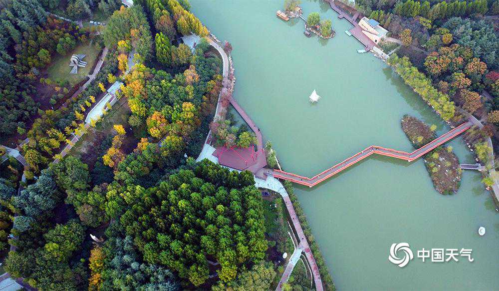 10月27日,河南郑州贾鲁河两岸彩叶斑斓,从空中俯瞰,绚丽多彩,赏心悦目。(图文/邓国勇)