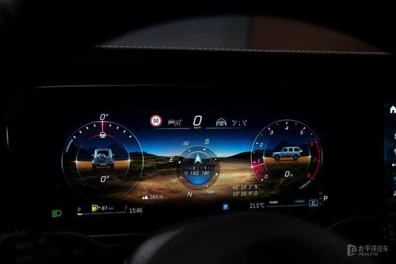 车内的全液晶仪表盘可以适时显示越野驾驶相关的专业数据,包括地平线、定位、指南针、海拔、前轮转向角、扭矩、功率、胎压、胎温、差速锁当前状态。