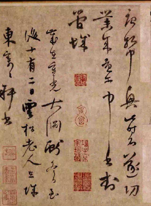 卷前钤陆氏“云间”、“幽谷一叟”印2方;卷末钤陆氏“宅山”、“陆氏居仁”、“静寿山”、“卧松亭”、“寄寄轩”款印5方。鉴藏印以项元汴、卞永誉、安岐三家最多,并有项氏“意字号”编号。《苕之水诗》卷书七言古诗一首,赞扬笔工陆文俊所制毛笔精良耐用,夺造化之功。据自署年款,此卷书于明洪武四年辛亥(1371年),是陆居仁晚年的草书精品。书法飘逸苍秀,得张旭、怀素、孙过庭遗意。后幅有元代张枢楷书次韵陆诗并记,乃张枢传世名迹。又有元代陈朴题跋、袁凯题诗各一段。此卷曾经清代乾隆内府、宣统内府收藏。