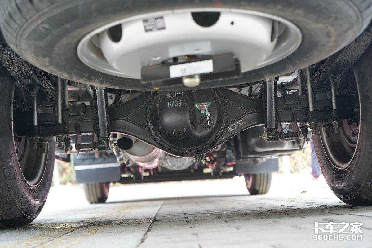 该车底盘采用直通式大梁,布置有1.5吨级前桥,2.5吨级后桥(速比4.875)。悬架是采用前3后3+2的钢板弹簧悬架设计,再加上双后轮的设计(轮胎规格185R15LT8PR),使得该车有着不错的承载能力,符合城市运输工况。