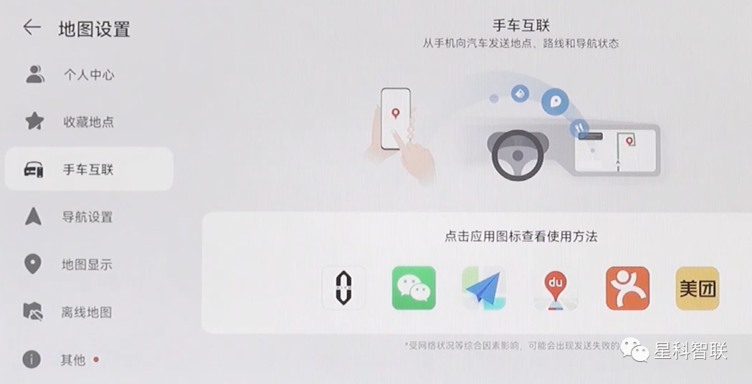 功能介绍:“手车互联”指用户可以将手机上的导航应用账号与车载系统的导航应用进行互联,方便快速将地址或目的地从手机发送到车载系统。