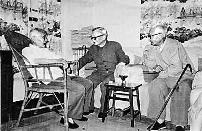 1982年7月7日下午,朱光潜(左)、茅以升(中)、宗白华三位老学者在朱光潜家会面谈心资料图片
