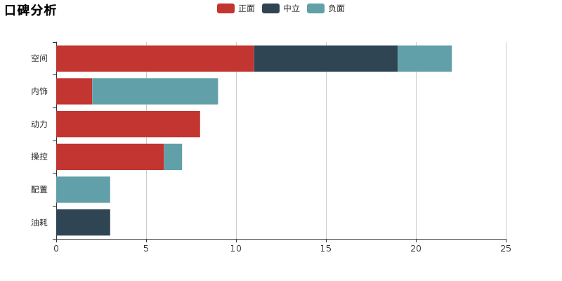 车主口碑通过对大量车主口碑的文本进行挖掘,我们提取了车主对于奔驰R级在空间、动力、操控、油耗、舒适性、外观、内饰、性价比、配置、电耗等维度的提及量,并且运用情感分析技术对每一次提及的语句进行了情感评分。