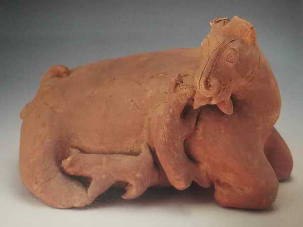 汉画中多见母羊哺乳的图像,多描摹得温情脉脉。广东省博物馆藏一件佛山大松岗出土的东汉陶羊,胎质为红陶,高12.3、长16、宽10厘米(图10)。一只母羊跪伏在地,头向右转,目光下垂,慈爱地注视着依偎在怀里的两只稚嫩娇憨小羊。小羊一前一后黏贴着母羊,一只垂直攀爬在母亲的肩部,四肢紧扣母亲的身躯,脑袋歪向一边、面庞凑至母亲的嘴唇,似在与母亲咩咩呀呀地絮语;另一只则挤在母亲的腹部,头部前伸、嘴唇前努,四肢立地,小尾上翘,似在开心吮吸奶汁。这件陶塑格外传神地摹刻出舔犊情深的情形。