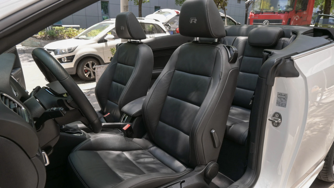 坐进车内,高R敞篷版并没有配备普通版那款对男性不太友好的桶椅,虽说视觉效果上这个GTI同款座椅没有那么战斗,但这款椅子支撑包裹舒适性也还不错。另外主驾驶座椅的成色很不错,像这种运动座椅常见的靠背、坐垫护翼的磨损并没有出现,坐垫外侧也没有压痕,填充物也很挺拔,我估计前任车主上下车的时候还是很小心的。
