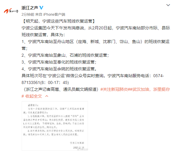 宁波公运集团今天下午发布消息说,从2月20日起,宁波汽车南站部分市际、县际班线恢复运营,具体为: