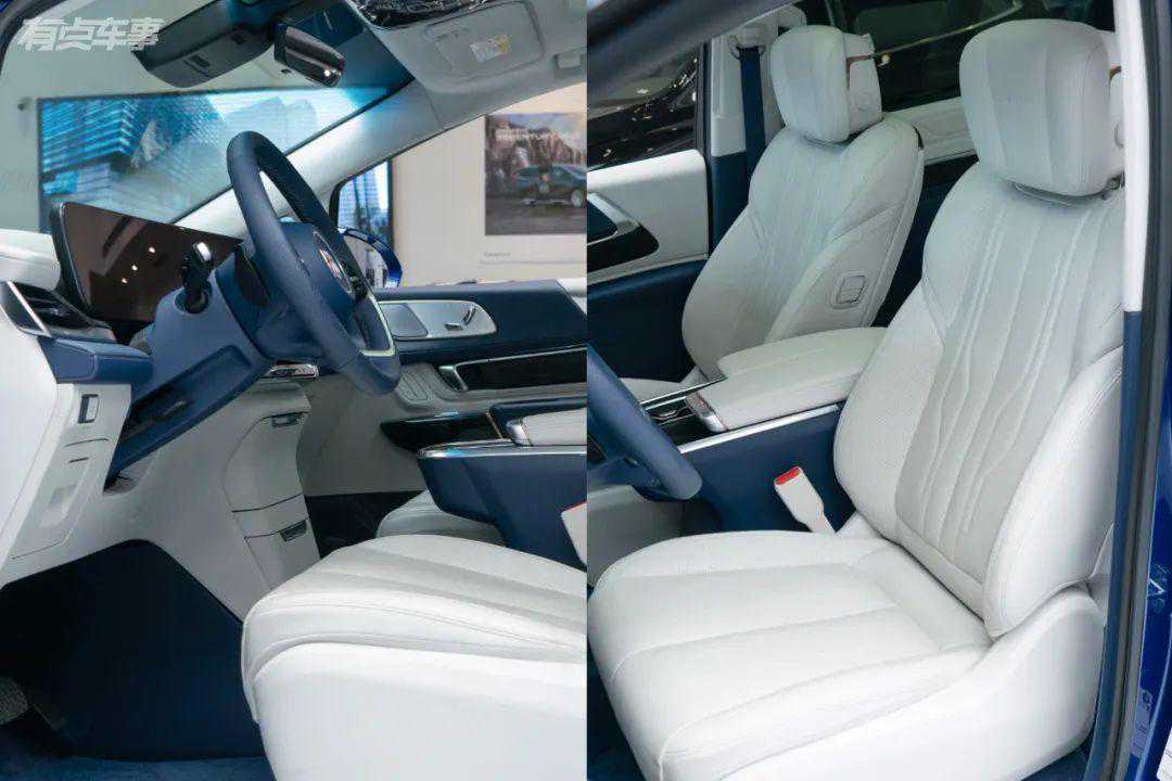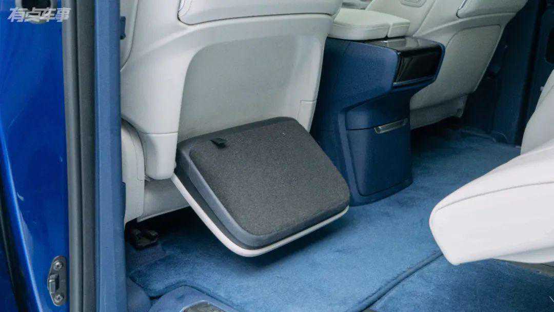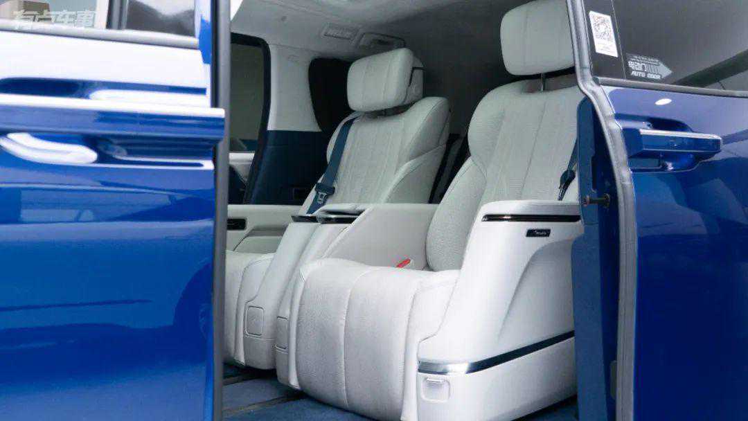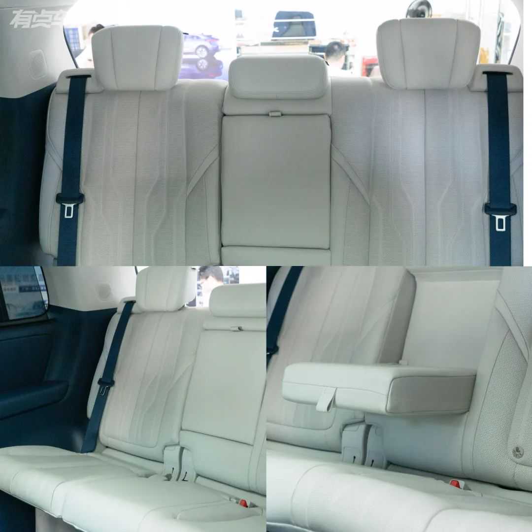 二三排的变化是这次实拍的重点,7座版使用了2+2+3的布局,第二排座椅配置与6座版基本一致,依旧是两张头等舱级别的座椅。第二排座椅的可调节范围非常大,并且可以左右滑动方便进出第三排。也因为二三排共用轨道,并且均为全电动调节,让第二排座椅拥有夸张的调节范围,并且哪怕处于最前的状态下,依旧能保证足够的后排空间。