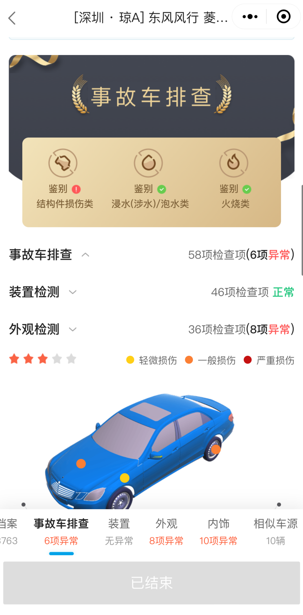 柏先生第一时间求助深圳天天拍车深圳门店,深圳门店在与海南门店沟通后,把车子带去龙华分店进行复检,结果与柏先生提供的相符,事故车排查有6项异常,鉴定为事故车无误。
