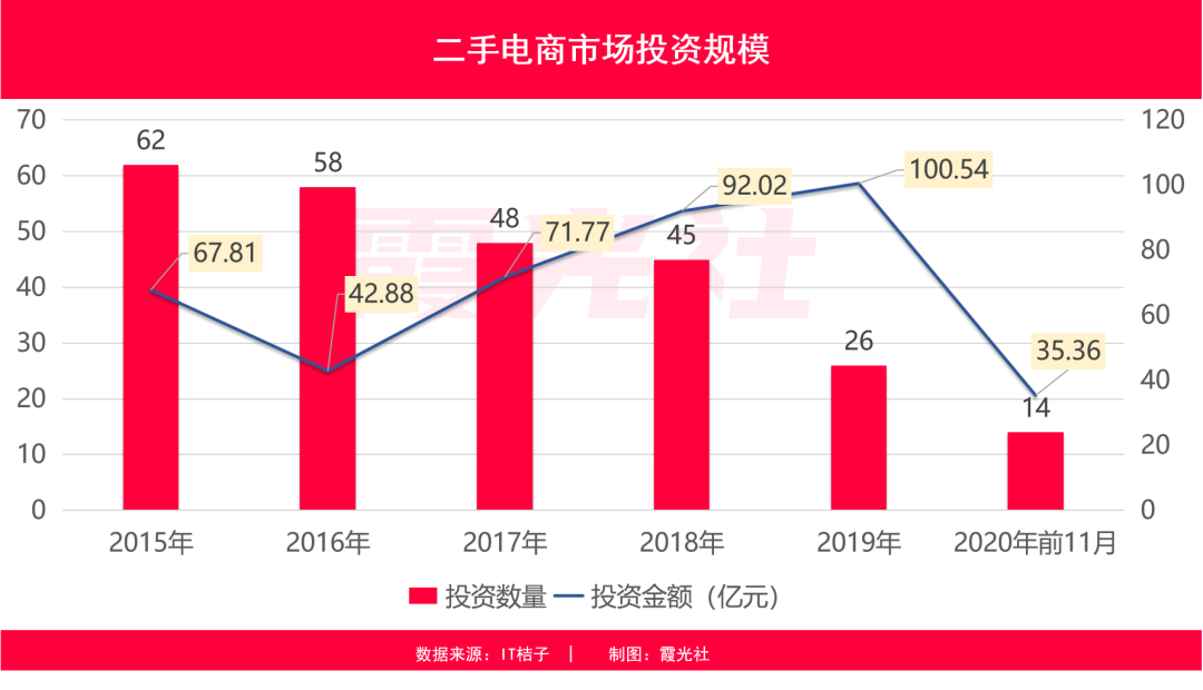 在资本方面,二手电商领域近年来略有降温。2015-2019年我国二手市场融资数量及金额均呈现波动变化态势。其中融资数量在逐年减少,2015年共发生62笔投资事件,而2020年前11个月则只发生了14笔。融资金额的波动变化较为明显,其中2016年和2020年11个月为低点,总融资金额分别为42.88亿和35.36亿。