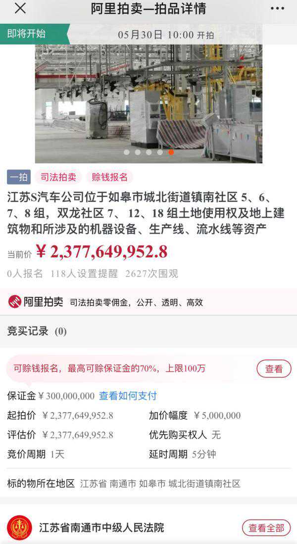 澎湃新闻()5月7日从阿里司法拍卖平台获悉,江苏S汽车公司位于南通如皋市的土地使用权及地上建筑物和所涉及的机器设备、生产线等资产将于5月30日上午首次开拍,保证金3亿元,竞价周期1天,起拍价近23.78亿元,加价幅度500万元。截至7日18时,尚无人报名参拍。